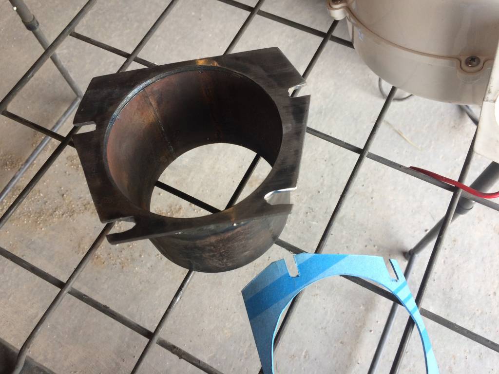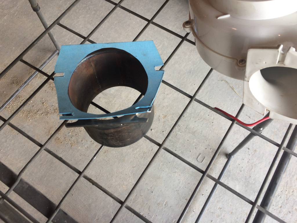 I cut a little piece of pipe off of the thick walled piece that will be buried under the fire part of the pit and welded on a flange. The flange was created by tracing the front of the fan onto cardboard to make a template. Found a piece of sheet metal that was thick enough and big enough and cut it out from that.
