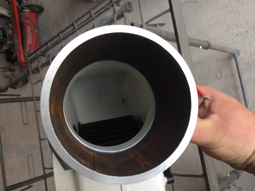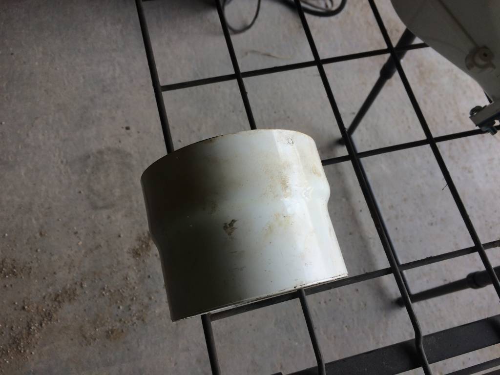 The next thing to make would be the final adapter that fits the greenish blue drain pipe that runs to the pit. The metal pipe flange i made has an outer diameter wider then the drain pipe, and the inner diameter is the same as the drain pipe. So to make an adapter, I first started with a drain pipe coupler and cut the length down a little. Then carefully with a handheld torch, I proceeded to carefully heat up one end of the coupler until the plastic started to get soft. When it seemed ready, I would take the metal flange and push it into the plastic coupler causing it to stretch around the metal part until it fit. This took a few times to get it done as the metal pipe would cool down the plastic pretty quick. I didn't want to heat the metal as I needed the plastic to cool and set.