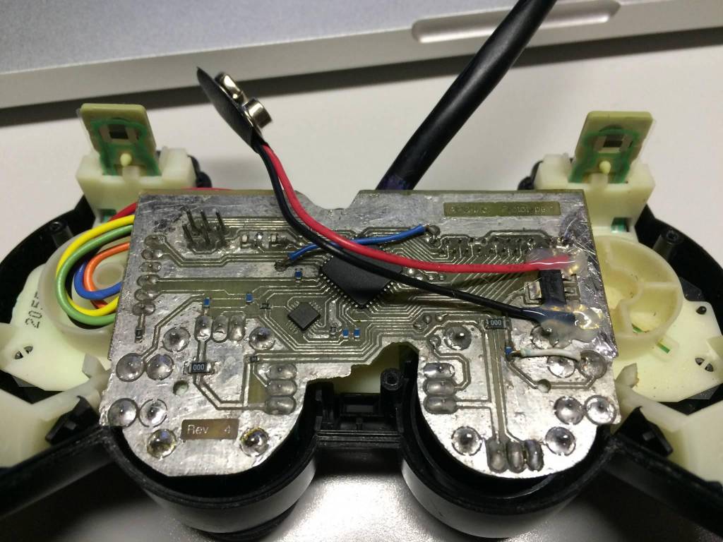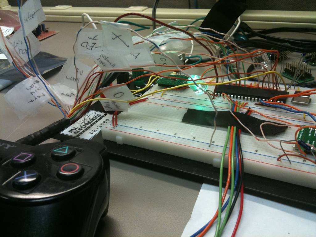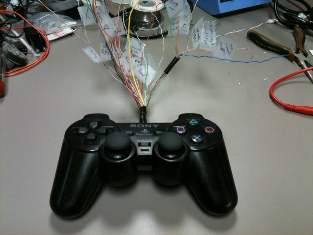 We started out with a standard PlayStation 1 controller but it was pretty beat up, so we went to the store and bought a used PlayStation 2 controller. I will admit, when I first was pinning it out, I totally forgot that unlike the PlayStation 1 controller, the PlayStation 2 controller is full analog input. It took a bit to completely remove the existing circuit board and pin out all the wires needed to connect to the buttons.