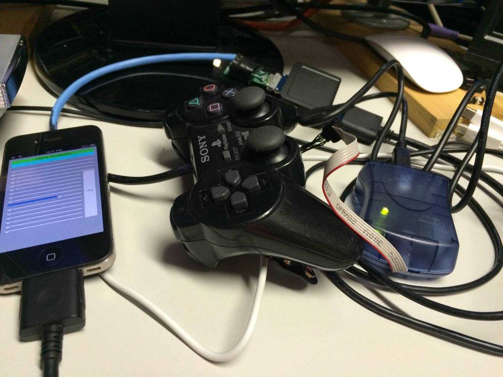 After it was finally assembled, Firmware had to be loaded onto the controller and a test app for the phone had to be written. Yes that's an iPhone 4, and I still have it to this day for testing things. The mobile app consisted of a bunch of sliders that would slide over a distance. That distance was determined by how hard you were pressing on the buttons. Yes this is a full analog controller as stated above so every button had a slider. Including the joysticks.