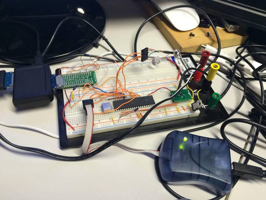 This is the test board I setup to write the firmware for the controller on. I could connect the Microcontroller to the phone with the adapter in the upper left corner. The little back box there is another Apple testing unit that would allow me to see the traffic between my accessory and the phone to make sure I was giving the phone what it expected to see.